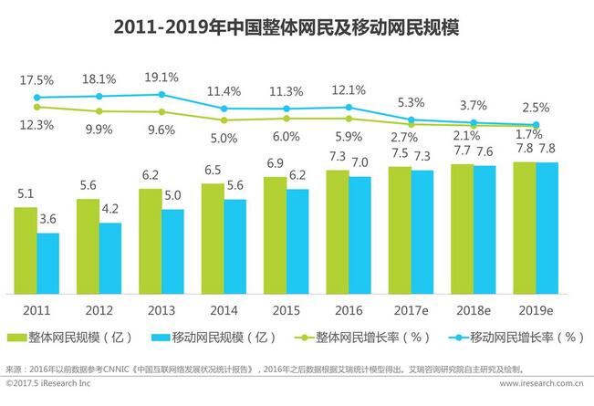 2016年中國(guó)移動(dòng)網(wǎng)民達(dá)到7.0億人,在網(wǎng)民中的占比達(dá)95.1%