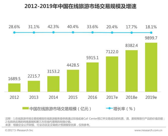2016年中國(guó)在線旅游市場(chǎng)持續(xù)擴(kuò)大,艾瑞統(tǒng)計(jì)數(shù)據(jù)顯示,2016年中國(guó)在線旅游市場(chǎng)交易規(guī)模為5915億元,同比增長(zhǎng)33.6%,預(yù)計(jì)2019年中國(guó)在線旅游市場(chǎng)交易規(guī)模將超9800億。