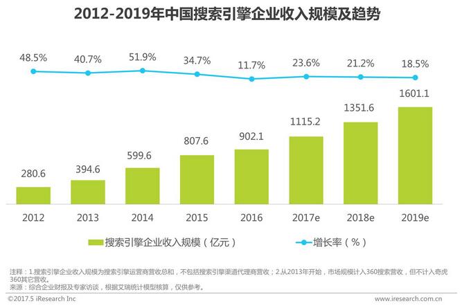 2016年中國(guó)搜索引擎企業(yè)收入規(guī)模達(dá)到902.1億元,同比增長(zhǎng)11.7%,2016年為搜索引擎企業(yè)的調(diào)整之年,預(yù)計(jì)到2019年,中國(guó)搜索引擎市場(chǎng)規(guī)模將超過(guò)1500億元。艾瑞分析認(rèn)為,2016年中國(guó)搜索引擎企業(yè)收入規(guī)模增長(zhǎng)放緩,亦主要受政策影響,尤其是頭部搜索企業(yè)營(yíng)收受到較大沖擊,從而影響了整體市場(chǎng)。