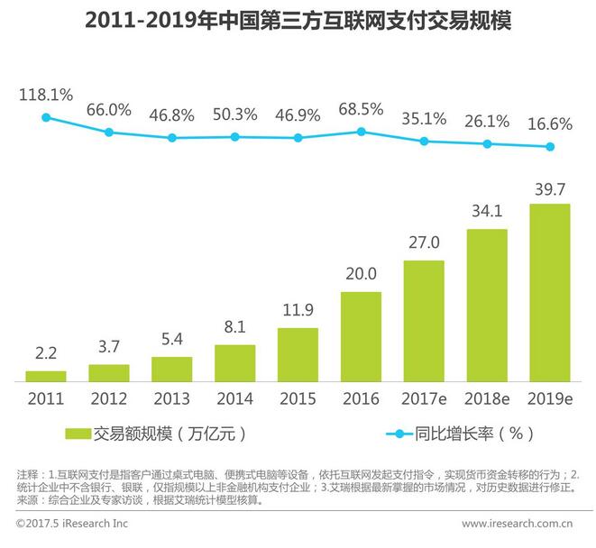 2016年中國(guó)第三方互聯(lián)網(wǎng)支付交易規(guī)模達(dá)到20萬(wàn)億元,環(huán)比增長(zhǎng)68.5%
