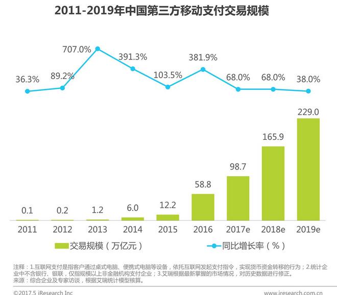 2016年中國(guó)第三方移動(dòng)支付交易規(guī)模達(dá)到58.8萬(wàn)億元,環(huán)比增長(zhǎng)381.9%