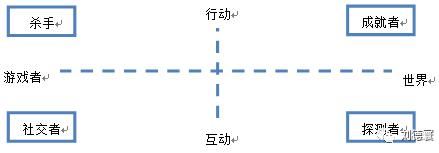在國外業(yè)界,經(jīng)常有組織機構采取調查問卷的方法,對青少年網(wǎng)絡生活進行細致、全面的調查研究。如美國格倫瓦奧德聯(lián)盟(Grunwald Associates)2000年進行的全國調查,結果顯示美國2-17歲的青少年玩游戲的占到80%。Amanda Lenhart、Maya Simon、Mike Graziano共同編寫的The Internet and Education: Findings of the Pew Internet & American Life是由美國的網(wǎng)絡宗教組織(Pew Internet Organization)對全國各州的大部分青少年發(fā)放問卷、電話調查和電子郵件的方式,對青少年的網(wǎng)絡生活進行了具體的分析研究——這類調查為國外學者深入剖析網(wǎng)絡游戲的使用群體,提供了豐富而寶貴的實證材料。 從調查領域回到研究領域,??怂雇ㄟ^分析網(wǎng)絡游戲的消費維度與生產(chǎn)維度的交叉結合,將網(wǎng)絡游戲從產(chǎn)業(yè)研究的層面,帶回到群體和行為研究的層面上來——認識到網(wǎng)絡游戲的服務與產(chǎn)品,同消費領域中使用群體的教育和休閑活動相互交叉、密切關聯(lián)[34](如圖3所示)。 圖3:消費維度與生產(chǎn)維度的交叉結合 在群體特征的維度上,有學者區(qū)分了網(wǎng)絡游戲使用者群體的四種類型:針對其他玩家的“殺手”(Killer),針對虛擬世界的“成就者”(Achiever),與其他玩家互動的“社交者”(Socialiser),與虛擬世界互動的“探測者”(Explorer)——以此來說明,網(wǎng)絡游戲玩家對游戲的使用,往往并不僅僅是游戲而已[35] [36](如圖4所示)。 圖4:網(wǎng)絡游戲使用者群體的四種類型 相似地,中國互聯(lián)網(wǎng)絡信息中心在“2010年中國網(wǎng)絡游戲用戶調研報告”中,針對游戲用戶的結構特征、消費行為、產(chǎn)品類型等方面進行了游戲用戶調研,將用戶劃分為體驗群、淺嘗群、PK群、心理需求群、沉迷群和商務群共六個群體。Information Solutions Group在2010年發(fā)布的《社會游戲研究》(Social Gaming Research)中,也有類似的分析。 另外,對于青少年網(wǎng)絡游戲(或更廣義上的網(wǎng)絡行為)的行為特征和投入程度,很多國內(nèi)學者也從青少年的階段特征、心理需求、互動需要、網(wǎng)絡認知、網(wǎng)絡情感、網(wǎng)絡活動、上網(wǎng)時間、同一性狀態(tài)、網(wǎng)絡內(nèi)容偏好、網(wǎng)絡游戲意識等角度進行了分析[37] [38] [39] [40] [41] [42]等?!獙W(wǎng)絡游戲使用群體的“理想類型化”,將研究從宏觀層面帶入中觀層次,從產(chǎn)業(yè)領域和商業(yè)模式引入了生活領域和使用模式。但是需要看到的是,對網(wǎng)絡游戲使用群體的描述和說明,仍然無法讓人看到使用者與網(wǎng)絡游戲之間關系的影響因素,以及網(wǎng)絡游戲會對使用者、特別是青少年群體,帶來怎樣的引導作用。