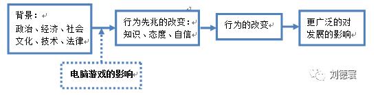 1.國外及臺灣學者對網(wǎng)絡游戲影響的分析 為了說明網(wǎng)絡游戲對使用者的影響,貝特朗(Bertrand)等人建構了電腦游戲領域中,人們溝通、交往與發(fā)展的模型;并從中指出,在社會背景(政治、經(jīng)濟、社會文化、技術、法律)影響個體行為的鏈條中,電腦游戲的介入,往往會起到重要的干預作用[43]等(如圖5所示)。但是貝特朗等人并沒有對這種干預的方向性給出明確的解釋。 圖5:電腦游戲的干預作用 相比于貝特朗帶有“無偏”性質的評價,更多的學者都在研究中明確表明了自己對網(wǎng)絡游戲之影響的態(tài)度和立場。格里夫斯(M. D. Griffiths)和戴維斯(Mark N. O. Davies)等人通過網(wǎng)絡問卷的方式,調查對比分析了成年玩家與青少年玩家游戲時間、頻率、最吸引人的因素等幾個方面。研究發(fā)現(xiàn),大部分青少年表示游戲中的暴力是最為吸引他們的原因。[44]日本學者Suvendrini Kakuch在Japan-Culture: Rising Juvenile Violence Shatters Traditions(2005)一文中指出,青少年玩暴力性的網(wǎng)絡游戲將對其身心帶來負面影響。Steven Lewd在Sex, Secret codes and Video games(2005)一文中也強調,網(wǎng)絡游戲不僅會占據(jù)學生大量的時間,而且有一些對其健康不利的網(wǎng)絡游戲。安德森等人(Anderson & Dill)更是從游戲的微觀方面考慮,以人格學變量(如暴力型人格)和情境性變量(如攻擊性內(nèi)容的游戲)為切入點,研究網(wǎng)絡游戲對青少年學生現(xiàn)實行為的影響[45](如圖6所示)。 圖6:攻擊性的網(wǎng)絡游戲對學生現(xiàn)實行為的影響 相比之下,尼古拉斯·依(Nicholas Yee)則看到了網(wǎng)絡游戲積極的一面。在系統(tǒng)分析了角色扮演游戲(MMORPG)玩家的各種心理和精神狀態(tài),包括時間和情感投入、動機、游戲中關系、戀人和家人、長時間上線游戲的病態(tài)心理等問題之后,該研究認為,網(wǎng)絡游戲的虛擬世界可以從多角度影響人們之間的關系,這種關系可以被虛擬世界的結構所改變;研究還指出,網(wǎng)絡游戲應被運用到教育領域,使教育充滿趣味性并達到更好的教學效果[46]。 同時,還有學者將心流理論(Flow experiences)引入網(wǎng)絡游戲群體的分析,從而確定了網(wǎng)絡游戲對使用者影響的“方向性”。該研究認為,游戲玩家會被置于四種“心流”狀況:流動、厭倦、焦慮和冷漠,而無論是暴力或者非暴力的游戲類型都不會激起玩家的侵略性。通過路徑分析,研究發(fā)現(xiàn),即便是暴力的網(wǎng)絡游戲也會對玩家的“心流”產(chǎn)生顯著的、間接的積極作用[47](如圖7所示)。 圖7:“心流”體驗對玩家的積極影響 另外,還有一些美國學者,也從積極方面研究了網(wǎng)絡游戲對學生的影響。如2002年4月15日,美國羅切斯特大學認知神經(jīng)學家達夫妮·巴維利厄在一次學術會議上作的實驗,通過實驗發(fā)現(xiàn)經(jīng)常玩網(wǎng)絡游戲的學生對細節(jié)有著非同一般的強烈敏感,證明了玩網(wǎng)絡游戲可以提高學生的注意力。Alfredo Flores在Using Computer Games and other Media to decrease Child Obesity(2006)文章中甚至聲稱,研究發(fā)現(xiàn)網(wǎng)絡游戲有助于孩子減肥。 臺灣的部分學者更強調對于網(wǎng)絡游戲的干預、控制、以及在教育中的應用。比如,國立臺灣師范大學的數(shù)字游戲研究實驗室,將網(wǎng)絡游戲對玩家的影響應用到了教育方法當中,幫助學生發(fā)現(xiàn)和建立恰當?shù)牡赖赂泻蛢r值觀。他們的研究發(fā)現(xiàn),游戲行為的傾向受到“行為控制”、“自我價值”、“游戲態(tài)度”、“主體規(guī)范”、“家庭教育”等多方面的顯著影響[48](如圖8所示)。 圖8:各種因素對行為傾向的影響 對網(wǎng)癮的預防與治療,一直是網(wǎng)絡游戲研究領域的一個焦點。臺灣學者趙杰夫、楊一鳴就透過對大學校園網(wǎng)絡沉迷情況、成因的了解,以學生需求為中心,配合學生在校期間各階段發(fā)展,以學術知能(Academic Knowledge)、學習社群(Learning Community)、轉化知能(Transitional Knowledge)、服務學習(Service-Learning)為主軸,規(guī)劃推出一套循序漸進的“大學校園防治網(wǎng)絡沉迷的同儕支援ACTS”方案[49]。 2.大陸學者對網(wǎng)絡游戲影響的分析 相比于國外及臺灣學者對網(wǎng)絡游戲的辯證態(tài)度,大陸學者對網(wǎng)絡游戲幾乎持“一邊倒”的負面評價,特別是從網(wǎng)絡成癮起步逐步探討網(wǎng)絡游戲對青少年身心、思想道德各方面的影響,形成對網(wǎng)絡游戲成癮是一種不良行為并對青少年帶來各方面負面影響的共識——這些負面影響包括:網(wǎng)絡游戲利用玩家的性格弱點,如攻擊性、報復心理、好勝、好色等,來設計活動和情節(jié),從而對玩家進行精神控制;網(wǎng)絡游戲利用玩家虛榮心、追求虛擬世界的成就感,對玩家進行心理引誘;網(wǎng)絡游戲以其精美的制作成為西方國家軟實力的重要載體,網(wǎng)絡游戲中所體現(xiàn)的西方世界觀、人生觀、價值觀有效地配合著游戲背景國的軟實力戰(zhàn)略,對我國的文化安全構成了巨大威脅,對青少年道德教育提出了巨大的挑戰(zhàn);網(wǎng)絡游戲成癮會促使青少年犯罪行為呈現(xiàn)出更多的暴力性、隨意性和突發(fā)性,等等[50] [51] [52] [53]。 在形成網(wǎng)絡依賴的原因方面,程亮從青年人的獨特屬性(青少年身心發(fā)展的特殊性、認知能力的局限性、固有的人格缺陷、自我同一性混亂