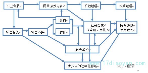 整體上看,國內(nèi)針對網(wǎng)絡游戲、特別是針對網(wǎng)絡游戲對青少年影響的研究思路正在逐漸與國際接軌,在網(wǎng)絡游戲分類定義、產(chǎn)業(yè)分析、群體研究和實際影響等幾個方面,都有相應的關注和探討,并無明顯的研究空白。然而與國外的研究工作相比,國內(nèi)在產(chǎn)業(yè)模型、影響機制和干預策略等研究領域的工作還有待深入,相關的實證研究需要進一步開展。 而無論國內(nèi)研究還是國外文獻,對青少年網(wǎng)絡游戲問題的分析都囿于某單一學科、單一維度,缺乏學科交叉的研究和對多角度綜合分析的視角。而針對網(wǎng)絡游戲對青少年的影響正是一個綜合性的社會問題,需要從傳播學、心理學、社會學、教育學、產(chǎn)業(yè)經(jīng)濟學等多學科的角度進行考量,也需要結合產(chǎn)業(yè)政策、社會輿論、媒介傳播、教育引導、行為規(guī)訓等多因素進行研究——在這個意義上,本文認為應以網(wǎng)絡游戲對青少年發(fā)展的引導和影響為主線,利用文獻研究、案例分析、問卷調查、重點訪談等各學科門類的方法,綜合研究網(wǎng)絡游戲傳播擴散方式、及其對青少年社會化過程的影響等基礎性問題。 第一,從研究對象來看,關于青少年網(wǎng)絡游戲問題的研究應涉及政府政策引導、網(wǎng)絡游戲產(chǎn)業(yè)、社會輿論與社會心理、傳播媒介和社會群體(特別是青少年群體)之間相互作用及影響的關系;重點關注各研究對象對青少年群體行為特征、社會化過程、虛擬社區(qū)建構等方面的影響。 第二,從研究層次上來看,從理論上應闡明網(wǎng)絡游戲在青少年群體中的傳播擴散方式、網(wǎng)絡游戲對青少年的“社會化”作用;在現(xiàn)實層面回應使用網(wǎng)絡游戲的青少年群體特征及行為傾向、青少年網(wǎng)絡游戲中的虛擬社會、網(wǎng)絡游戲導致的青少年網(wǎng)癮等問題;并在對策研究層面,從大眾輿論、社會態(tài)度、家庭教育、學校教育等角度,探討對青少年網(wǎng)絡游戲使用的干預和引導。 第三,從研究線索來看,應以網(wǎng)絡游戲對青少年群體的影響為主線,關注網(wǎng)絡游戲使用、網(wǎng)絡游戲傳播、針對網(wǎng)絡游戲的社會態(tài)度、網(wǎng)絡游戲的內(nèi)容、網(wǎng)絡游戲的虛擬性、網(wǎng)絡游戲導致的網(wǎng)癮現(xiàn)象等自變量,對青少年成長、發(fā)展與社會化這一因變量的影響和作用機制(如圖9所示),從而更有針對性地實現(xiàn)和完成對青少年網(wǎng)絡游戲行為的引導和教育。 圖9:青少年網(wǎng)絡游戲綜合研究思路