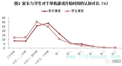 (二)首次接觸游戲時(shí)間——完美的1年時(shí)間差 無(wú)論是單機(jī)游戲還是網(wǎng)絡(luò)游戲,家長(zhǎng)了解的孩子開(kāi)始玩游戲的時(shí)間與孩子自我填答之間都有著1年的時(shí)間差。在家長(zhǎng)的認(rèn)知中,開(kāi)始玩游戲的孩子從三四年級(jí)開(kāi)始增加,在五六年級(jí)達(dá)到頂峰,之后開(kāi)始逐漸下降。而從學(xué)生自填的數(shù)據(jù)來(lái)看,孩子開(kāi)始玩游戲的歷程要比家長(zhǎng)以為的整體提前一年。我們都可以看到,學(xué)生和家長(zhǎng)之間存在信息不對(duì)稱,家長(zhǎng)的認(rèn)知和孩子的實(shí)際情況存在整體的偏移。這向我們描述了一種在孩子中普遍的現(xiàn)象,無(wú)論玩什么類型的游戲,孩子一開(kāi)始玩的時(shí)候都是偷偷玩沒(méi)讓父母知道,父母過(guò)了一年才有明顯察覺(jué),到了實(shí)在瞞不住的時(shí)候孩子才會(huì)向家長(zhǎng)承認(rèn)自己在玩游戲,當(dāng)家長(zhǎng)問(wèn)起孩子是什么時(shí)候開(kāi)始玩的,孩子會(huì)告訴家長(zhǎng)最近才開(kāi)始玩。這樣家長(zhǎng)認(rèn)知中孩子開(kāi)始玩游戲的時(shí)間,實(shí)際上很可能家長(zhǎng)第一次發(fā)現(xiàn)孩子玩游戲的時(shí)間,而非孩子第一次接觸游戲的時(shí)間點(diǎn)。