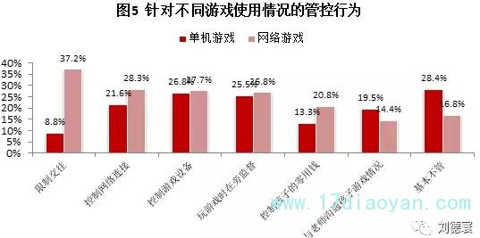 (四)主要游戲場(chǎng)所認(rèn)知:同學(xué)家還是網(wǎng)吧? 對(duì)于使用網(wǎng)絡(luò)游戲的主要地點(diǎn),家長(zhǎng)和學(xué)生群體都認(rèn)同自己家里是主要空間,然而家長(zhǎng)和學(xué)生在另外兩個(gè)選項(xiàng)上出現(xiàn)了明顯的互補(bǔ),是非常值得重視的現(xiàn)象。 28.5%的家長(zhǎng)認(rèn)為孩子主要在同學(xué)家里玩網(wǎng)游,而只有8%的學(xué)生表示在同學(xué)家里玩網(wǎng)游。與之形成對(duì)應(yīng)的是,24.1%的學(xué)生表示自己主要在網(wǎng)吧玩網(wǎng)游,而家長(zhǎng)認(rèn)為孩子主要在網(wǎng)吧玩網(wǎng)游的比例只有15.0%。這就是說(shuō),家長(zhǎng)低估了孩子去網(wǎng)吧的比例,更多地認(rèn)為孩子去了同學(xué)家里。這與我們?cè)卺槍?duì)青少年的定性調(diào)查中得到的結(jié)論相印證,“一起玩游戲”是青少年群體與朋友圈進(jìn)行共同娛樂(lè)活動(dòng)的主要行為,而所謂的“一起”并不僅指共同在線,還包括空間上的共同在場(chǎng),網(wǎng)吧成為青少年游戲使用的重要場(chǎng)所,在中小城市這種現(xiàn)象更普遍。 為什么孩子會(huì)出現(xiàn)這種認(rèn)知偏差呢?我們認(rèn)為可能與家長(zhǎng)嚴(yán)厲的態(tài)度和有限的管控能力有關(guān),家長(zhǎng)平時(shí)對(duì)于孩子去網(wǎng)吧的否定態(tài)度讓孩子認(rèn)識(shí)到去網(wǎng)吧是一種不被認(rèn)同的行為,會(huì)帶來(lái)家長(zhǎng)的管控行為;而家長(zhǎng)對(duì)青少年的直接管理又主要發(fā)生在家庭空間里,對(duì)其外出實(shí)際行為缺乏有效管理,這種情況必須依賴家長(zhǎng)與子女之間的相互信任機(jī)制的建立才可能達(dá)到及時(shí)的了解與有效管理。 (五)游戲付費(fèi)行為——認(rèn)知基本一致 由于被訪者的孩子尚在學(xué)校讀書(shū)沒(méi)有經(jīng)濟(jì)來(lái)源,孩子游戲的花費(fèi)絕大多數(shù)都來(lái)自家長(zhǎng)平時(shí)的零花錢(qián),因而家長(zhǎng)對(duì)孩子游戲花費(fèi)的把握與學(xué)生實(shí)際情況基本一致,家長(zhǎng)認(rèn)為孩子在游戲上的花費(fèi)甚至比孩子的自填情況稍多。 數(shù)據(jù)來(lái)源: 騰訊平臺(tái)數(shù)據(jù)收集系統(tǒng),base=5401 騰訊平臺(tái)數(shù)據(jù)收集系統(tǒng),base=14558 (一)管控行為概覽 管控行為是家長(zhǎng)基于對(duì)自己孩子的游戲活動(dòng)了解的基礎(chǔ)上,對(duì)孩子游戲進(jìn)行干預(yù)和控制的行為。管控行為既包括直接對(duì)游戲設(shè)備和游戲時(shí)間進(jìn)行硬性限制,也包括間接地管理孩子的交際圈和零花錢(qián)等。 正如我們將在以下分析中所看到,家長(zhǎng)對(duì)于青少年玩網(wǎng)絡(luò)游戲的看法與玩單機(jī)游戲相比更加負(fù)面,表現(xiàn)在管控行為上也有所不同。如圖8所示,對(duì)子女玩單機(jī)游戲基本不管的家長(zhǎng)比例遠(yuǎn)高于對(duì)子女玩網(wǎng)絡(luò)游戲基本不管的家長(zhǎng)比例。進(jìn)一步說(shuō)明了在家長(zhǎng)看來(lái),單機(jī)游戲的負(fù)面影響要小于網(wǎng)絡(luò)游戲的負(fù)面影響,因而相對(duì)更不需要管控。 在管控行為上,控制網(wǎng)絡(luò)設(shè)備、控制網(wǎng)絡(luò)連接和孩子玩游戲時(shí)親自在旁監(jiān)督是家長(zhǎng)針對(duì)子女玩單機(jī)游戲的主要管控行為。在網(wǎng)絡(luò)游戲的管控方面,家長(zhǎng)更傾向于通過(guò)限制孩子與玩游戲的小孩交往來(lái)管理子女的網(wǎng)絡(luò)游戲使用行為。顯然在家長(zhǎng)看來(lái),網(wǎng)絡(luò)游戲是一種非常受到人際影響的行為。
