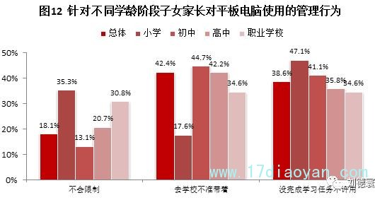 在平板電腦的管理上呈現(xiàn)出與手機(jī)使用管理相似的特征。大體上也是青少年所處的學(xué)齡階段越低,家長(zhǎng)對(duì)青少年的平板電腦使用的管理就越嚴(yán)格。在這里,擁有平板電腦的小學(xué)生家長(zhǎng)個(gè)案較少(僅17個(gè)),小學(xué)生家長(zhǎng)在這一問(wèn)題上的回答可能有所偏差。