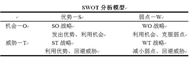 “SWOT”是Strength、Weakness、Opportunity、Threat四個(gè)英文單詞的縮寫,這個(gè)模型主要是通過分析企業(yè)內(nèi)部和外部存在的優(yōu)勢(shì)和劣勢(shì)、機(jī)會(huì)和挑戰(zhàn)來概括企業(yè)內(nèi)外部研究結(jié)果的一種方法。