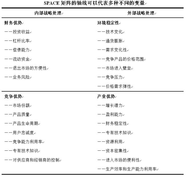 SPACE矩陣要按照被研究企業(yè)的情況而制定,并要依據(jù)盡可能多的事實(shí)信息。根據(jù)企業(yè)類型的不同,SPACE矩陣的軸線可以代表多種不同的變量。如,投資收益、財(cái)務(wù)杠桿比率、償債能力、流動(dòng)現(xiàn)金、流動(dòng)資金等。