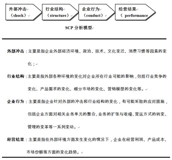 SCP(structure、conduct、performance)模型,分析在行業(yè)或者企業(yè)收到表面沖擊時(shí),可能的戰(zhàn)略調(diào)整及行為變化。