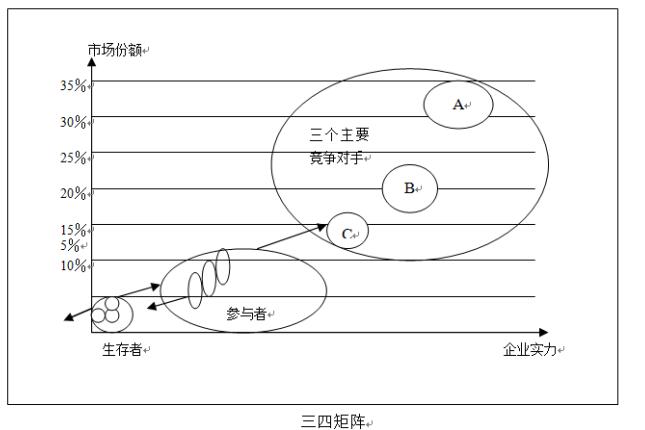 在一個(gè)穩(wěn)定的競(jìng)爭(zhēng)市場(chǎng)中,參與市場(chǎng)競(jìng)爭(zhēng)的參與者一般分為三類,領(lǐng)先者、參與者、生存者。優(yōu)勝者一般是指市場(chǎng)占有率在15%以上,可以對(duì)市場(chǎng)變化產(chǎn)生重大影響的企業(yè),如在價(jià)格、產(chǎn)量等方面;參與者一般是指市場(chǎng)占有率介于5%~15%之間的企業(yè),這些企業(yè)雖然不能對(duì)市場(chǎng)產(chǎn)生重大的影響,但是它們是市場(chǎng)競(jìng)爭(zhēng)的有效參與者;生存者一般是局部細(xì)分市場(chǎng)填補(bǔ)者,這些企業(yè)的市場(chǎng)份額都非常低,通常小于5%。