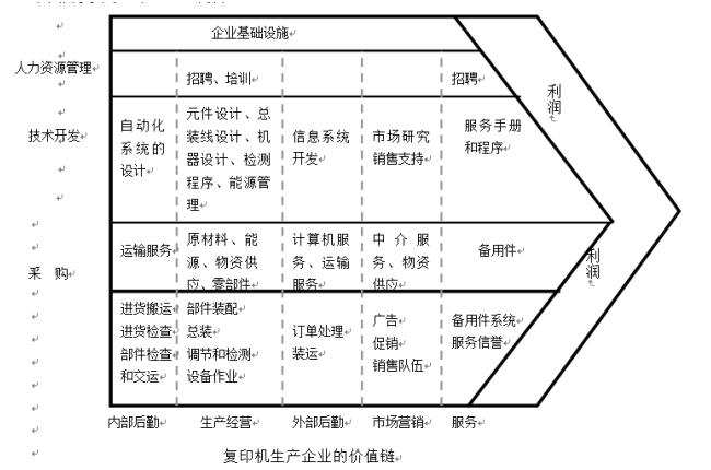 價(jià)值鏈的框架是將鏈條從基礎(chǔ)材料到最終用戶分解為獨(dú)立工序,以理解成本行為和差異來源。通過分析每道工序系統(tǒng)的成本、收入和價(jià)值,業(yè)務(wù)部門可以獲得成本差異、累計(jì)優(yōu)勢(shì)。下圖為復(fù)印機(jī)生產(chǎn)企業(yè)的價(jià)值鏈。
