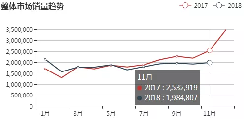 截至11月份,2018年國(guó)內(nèi)乘用車?yán)塾?jì)銷量為20,374,229輛,累計(jì)同比跌幅擴(kuò)大至3.6%。