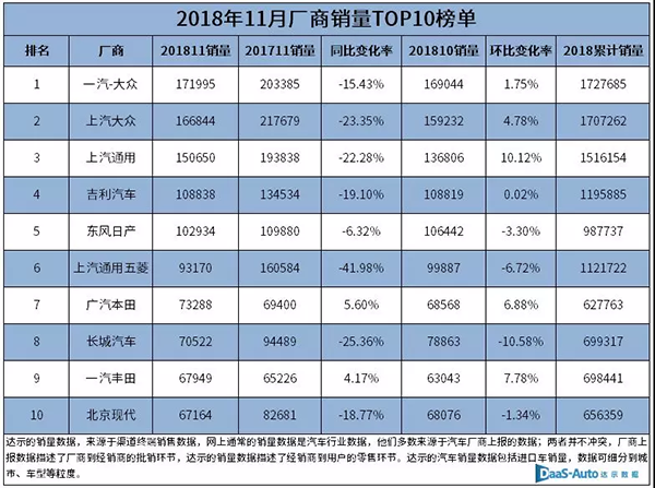 排名榜單前三的一汽-大眾、上汽大眾和上汽通用雖然和10月相比,環(huán)比均有所上漲,但同比跌幅都在15%以上,分別為15.43%、23.35%和22.28%,銷量則分別為171,995輛、166,844輛和150,650輛。