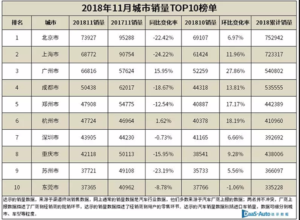 位列前三的城市排名與10月一致,分別是北京市、上海市和廣州市,其中北京市11月銷量為73,927輛,同比下跌了22.42%,累計(jì)銷量為752,942輛;位列第二的上海同比也下跌了24.22%,11月銷量為68,772輛,今年截至11月累計(jì)銷量為723,317輛。