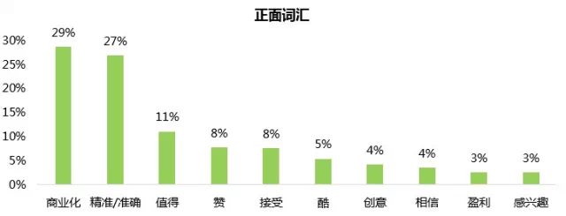正面詞匯“商業(yè)化”源于“微信正在探索商業(yè)化道路”,“精準(zhǔn)/準(zhǔn)確”主要體現(xiàn)在微信利用大數(shù)據(jù)對(duì)用戶進(jìn)行群體劃分。