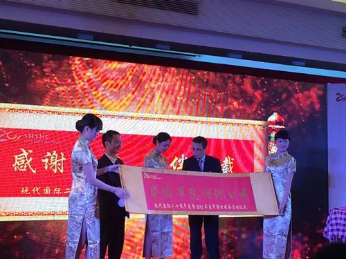 (圖:總裁吳應(yīng)波和副總裁??飿s共同啟動(dòng)了20周年系列慶典儀式,并宣布現(xiàn)代國際20周年慶暨2015春節(jié)聯(lián)歡晚會(huì)正式開幕)