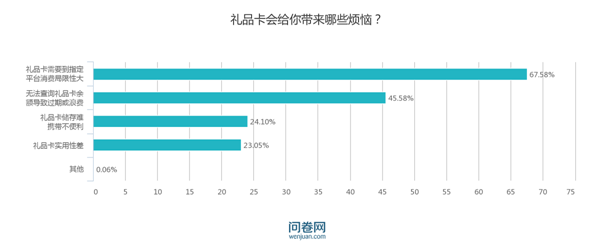 同時(shí),從圖表中可以看出,有45.58%的受訪者表示,無(wú)法查詢禮品卡余額,導(dǎo)致禮品卡有殘值浪費(fèi),讓人感到煩惱。的確,目前市面上禮品卡只能去相對(duì)應(yīng)的平臺(tái)或門店查詢余額,在日常情況中,并不能隨時(shí)隨地查看余額,對(duì)于使用頻率不高的卡,常會(huì)導(dǎo)致過(guò)期,余額浪費(fèi)的情況。