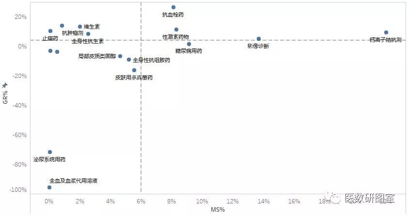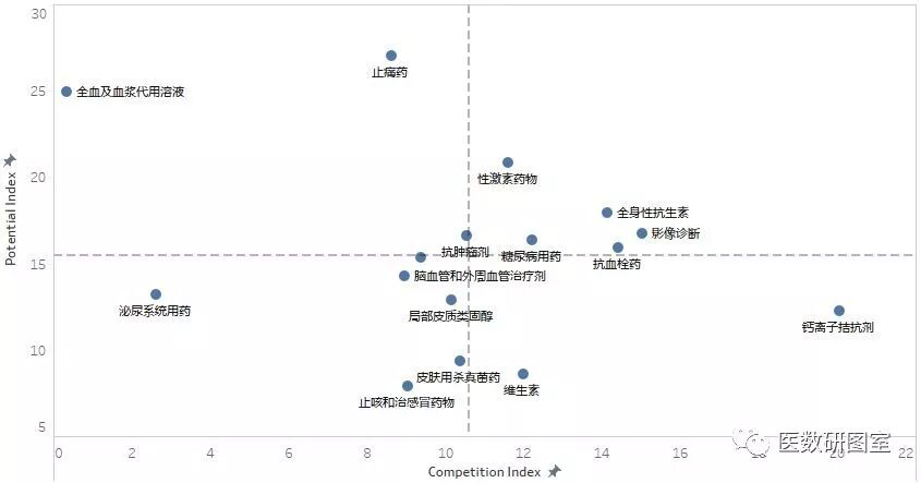 通過(guò)這個(gè)新的矩陣分析,我們可以得到新的決策:對(duì)于右上角象限,市場(chǎng)潛力和產(chǎn)品競(jìng)爭(zhēng)力“雙高”的產(chǎn)品,我們選擇的策略是加大投資,提高產(chǎn)品的競(jìng)爭(zhēng)力,這些產(chǎn)品是糖尿病用藥、全身性抗生素、抗血栓藥、性激素藥和影像診斷。對(duì)于右下角象限,市場(chǎng)潛力低、產(chǎn)品競(jìng)爭(zhēng)力高的產(chǎn)品,這部分產(chǎn)品需要維持投資,無(wú)需再加大投資,在這個(gè)象限的是鈣離子拮抗劑。對(duì)于左上角象限,銷售增長(zhǎng)率高、市場(chǎng)份額低的產(chǎn)品,我們采取選擇性的投資策略,這個(gè)象限的產(chǎn)品包括抗腫瘤藥、止疼藥和全血及血漿代用溶液。