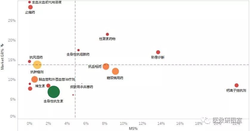 我們認(rèn)為市場(chǎng)越大、市場(chǎng)增長(zhǎng)率越高、產(chǎn)品的市場(chǎng)份額越小,市場(chǎng)的潛力就越大,對(duì)于這部分產(chǎn)品我們應(yīng)該加大投資。但是,我們發(fā)現(xiàn)我們并不是很容易給出決策了。比如,左上角的全血及血漿代用溶液,雖然市場(chǎng)的增長(zhǎng)率很高,但是我們根據(jù)之前的波士頓矩陣可以發(fā)現(xiàn),B公司的全血及血漿代用溶液幾乎退市。再比如,左下角的抗生素市場(chǎng),雖然市場(chǎng)增長(zhǎng)率和B公司的產(chǎn)品市場(chǎng)份額都很低,但是抗生素市場(chǎng)的體量巨大,它的市場(chǎng)增長(zhǎng)率增長(zhǎng)1%帶來(lái)的市場(chǎng)增量,或是市場(chǎng)份額變化1%帶來(lái)的產(chǎn)品銷量貢獻(xiàn),都是其它市場(chǎng)所不能比的,對(duì)于這樣的市場(chǎng)我們不可能選擇謹(jǐn)慎的撤退策略。同樣的,雖然性激素藥物、止疼藥、影像診斷等市場(chǎng)增長(zhǎng)快,但我們還是會(huì)選擇投資市場(chǎng)體量大的抗腫瘤藥、抗血栓藥和糖尿病用藥。