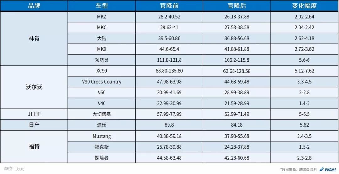 威爾森認(rèn)為,汽車關(guān)稅的下降對(duì)消費(fèi)者是有利的,但卻是有限的。據(jù)測(cè)算,關(guān)稅降至15%,理論測(cè)算報(bào)價(jià)應(yīng)下降8%,但實(shí)際中間環(huán)節(jié)還會(huì)分享紅利,據(jù)目前信息梳理可得,進(jìn)口汽車廠商指導(dǎo)價(jià)平均降幅約為6%-7%,仍具有一定的彈性空間。