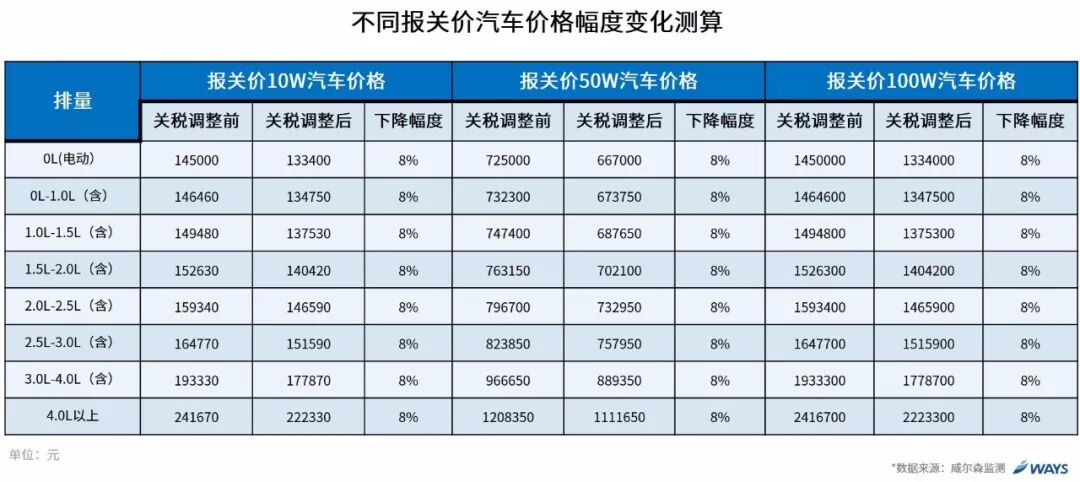 我們通過測(cè)算,不同報(bào)關(guān)價(jià)針對(duì)不同排量,當(dāng)關(guān)稅下降10%之后終端價(jià)格下降幅度均為8%。(理想狀態(tài)下,關(guān)稅下調(diào)額度完全折算)