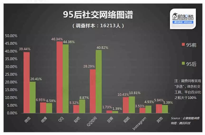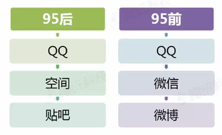 95前都用QQ、微信、微博,95后(就是不到20歲的少年)用的是QQ、空間、貼吧和微信!